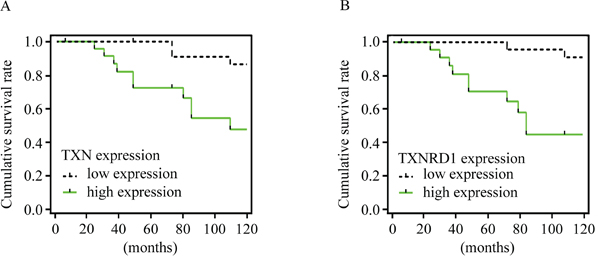 Figure 2: TXN and TXNRD1 expression are correlated with survival rate of patients with SACC. Kaplan-Meier survival curves for cumulative survival rate of 47 patients with SACC. Expressions of TXN A. and TXNRD1 B. were positively correlated with poor survival rate.