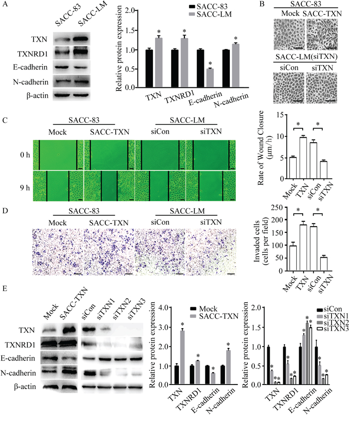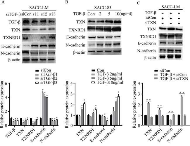 Our previous studies have shown that TGF-β induces EMT progression in SACC. In this study, we have further identified the role of TXN in TGF-β-induced EMT. Either knocking down TGF-β with siRNA in SACC-LM cells, or treating with TGF-β at different doses in SACC-83 cells, we found that TXN, TXNRD1, E-cadherin, and N-cadherin were regulated by TGF-β accordingly. In addition, knockdown of TXN followed by treatment with TGF-β could attenuate the effects of TGF-β on EMT. These data indicate that TXN is involved in the TGF-β-induced EMT in SACC.