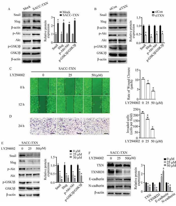 Figure 5: TXN regulates EMT in SACC cells through the Akt/GSK-3β/Snail signaling pathway. Immunoblotting analysis of Snail, Slug, p-Akt/Akt, and p-GSK3β/GSK3β expression in Mock, SACC-TXN A. siCon, and siTXN B. cells. Wound closure assays (C. scale bar = 100 μm) and invasion assays (D. scale bar = 200 μm) in SACC-TXN treated with or without PI3K inhibitor LY294002 (25 μM, 50 μM) for 12 hours. Effects of LY294002 on expressions of Snail, Slug, p-Akt/Akt, and p-GSK3β/GSK3β E. or TXN, TXNRD1, E-cadherin, and N-cadherin F. in SACC-TXN cells. β-actin was used as loading control. Data represent means ± SD of three independent experiments (*P < 0.05).