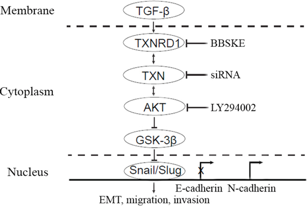 TXNRD1 plays an important role in catalyzing the NADPH dependent regulation of TXN [25]. TXNRD1 knockdown markedly suppresses tumor progression and metastasis and decreases transcription levels of cancer-related proteins [26]. To examine the role of TXNRD1 in EMT of SACC-LM cells, we used TXNRD1 inhibitor, 1, 2- [bis (1, 2-Benzisoselenazolone-3 (2H) -ketone)] ethane (BBSKE) to treat SACC-LM cells and found that activity of TXNRD1 was decreased in a dose-dependent manner (Figure 6A). In addition, N-cadherin expression and Akt/GSK-3β phosphorylation were significantly decreased while E-cadherin expression was increased after BBSKE treatment in SACC-LM cells (Figure 6B). These findings imply that TXN and TXNRD1 could target PI3K/Akt/GSK3β which may impact EMT of SACC cells (Figure 7).