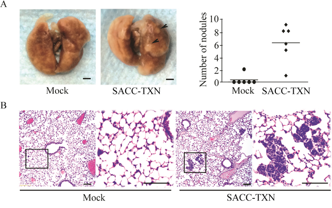 Figure 8: Overexpression of TXN enhances lung metastasis of SACC-83 cells in vivo. A. Mice were inoculated intravenously with 3 × 106 Mock or SACC-TXN cells. Eight weeks later, lung surface metastatic nodules (arrows) were observed and quantified. B. Representative hematoxylin and eosin staining showed that metastatic tumor cells in lung tissues section of mice injected intravenously with Mock or SACC-TXN cells. Scale bar = 100 μm.