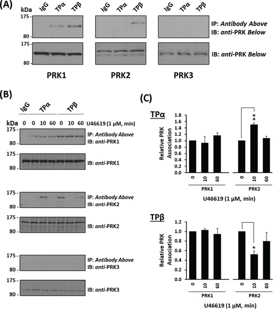 Collectively, these data (Figure 1 & 2) confirm a constitutive association between PRK1 and TPα/TPβ which is not substantially regulated in response to receptor stimulation. In addition, while PRK2 may associate with TPβ, but not TPα, in the absence of agonist, both these associations are dynamically regulated in response to receptor activation. In the case of PRK3, while no complex was observed between TPα or TPβ in PC-3 cells, studies in HEK293 cells show that specific complexes can occur, and which are regulated in an agonist-dependent manner.