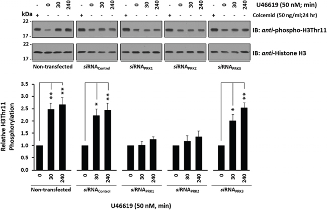 Figure 6: Effect of TP agonist stimulation on PRK-mediated H3Thr11 phosphorylation in PC-3 cells. PC-3 cells were transfected for 72 hr with 30 nM siRNAPRK1, siRNAPRK2, siRNAPRK3 or, as controls, with a scrambled siRNA (siRNAControl) prior to stimulation with U46619 (50 nM; 0–240 min) or vehicle (0.0005% EtOH), where non-transfected cells served as a reference. As a positive reference for H3Thr11 phosphorylation, cells were growth-arrested by treatment with colcemid (50 ng/ml) for 24 hr. In all cases, extracted histones were immunoblotted (IB) with anti-phospho-H3Thr11 (upper panels) and back-blotted with anti-histone H3 (lower panels) antisera. The bar charts show the mean relative levels of H3Thr11 phosphorylation relative to total histone H3 levels, as determined by densitometry (± SEM, n ≥ 3), where levels in the vehicle-treated cells were assigned a value of 1. The asterisks indicate where U46619 stimulation resulted in significant changes in the levels of H3Thr11 phosphorylation, where * and ** indicate p < 0.05 and p < 0.01, respectively.