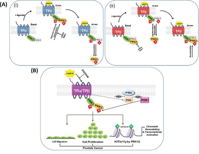 Figure 8: Proposed model of the association of TPα/TPβ with PRK1-3, and the implications for prostate tumour progression. Panel A. In the prostate carcinoma PC-3 cell line, under constitutive/basal conditions PRK1 is recruited into a complex with both the TPα (i) and TPβ (ii) isoforms while PRK2 distinctly forms a complex only with that of TPβ. Following short-term agonist (U46619)-stimulation of TPα/TPβ (10 min), whereas there is no measurable alteration in the level of PRK1 associated with either TP isoform, a change occurs whereby PRK2 dissociates from TPβ (ii), while transiently associating into a complex with TPα (i). Following prolonged agonist-activation of TPα/TPβ (60 min), PRK2 dissociates from TPα (i) and is recruited once more into a complex with TPβ (ii). Hence, the PRK:TPα (i) and PRK:TPβ (ii) complexes observed at 60 min post-agonist mimic those found basally, in the absence of agonist. Although not found to occur in PC-3 cells, PRK3 also has the ability to associate with TPα (i) and TPβ (ii), such-as when co-expressed in HEK293 cells. In response to receptor stimulation, while there is no measurable alteration in the level of PRK3 associated with TPβ (ii), PRK3 transiently dissociates from TPα (i) at 10 min post-agonist before re-associating following prolonged agonist stimulation (60 min). Agonist-stimulation of both TPα and TPβ leads to T-loop phosphorylation-dependent activation of PRK1, PRK2 and PRK3, where each of the kinases remain in the activated state for at least 60 min post-agonist. Thus, while PRK2 and PRK3, but not PRK1, transiently associate/disassociate from the given TPα/TPβ complex in response to agonist stimulation, the agonist-induced phosphorylation & activation of each of the PRKs is more sustained. Panel B. In PC-3 cells, TPα/TPβ is found associated in a complex with both PRK1 and PRK2. Agonist-activation of TPα/TPβ leads to activation of phosphatidylinositol 3′kinase (PI3’K) and, in turn, to activation of 3-phosphoinositide-dependent protein kinase-1 (PDK-1), the master-regulator AGC kinase that leads to subsequent activation of the PRKs through phosphorylation of the essential Thr within their activation loop (T-loop phosphorylation). Critically, in response to TPα/TPβ stimulation, activation of both PRK1 and PRK2 leads to chromatin remodelling (H3Thr11 phosphorylation) in prostate cells and to enhanced cell proliferation and migration, thereby exacerbating the pathological state in prostate cancer. Note; TPα/TPβ-regulation of Gq/PLCβ, G12/Rho or of the ERK signalling cascades are not shown.