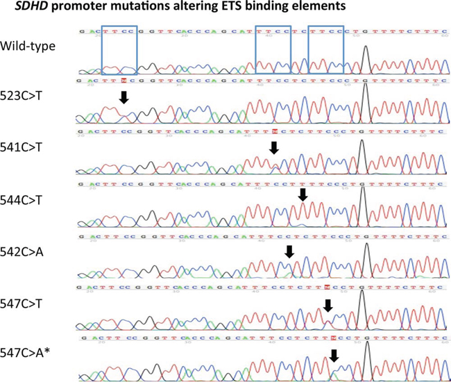 Figure 1: Recurrent SDHD promoter mutations altering ETS binding elements. Sanger sequencing chromatograms of the identified recurrent SDHD promoter mutations located at chr.11:111,957,523C>T(TTCC>TTTC), chr.11:111,957,541C > T (TTCC>TTTC), chr.11:111,957,544C>T (CTTCC>TTTCC), chr.11:111,957,542C>A (TTCC>TTCA) and chr.11:111,957,547 (CTTCC>CTTTC and CTTCC>CTTAC) (according to human genome assembly [hg19]). The mutations locations are highlighted with black arrows. A wild-type promoter sequence for comparison is shown on the top. The blue boxes in the wild-type SDHD promoter sequence show the three different ETS binding elements. * signifies the mutation also identified in a germ-line sample.
