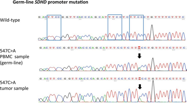 For tumors in which SDHD promoter mutations were identified, matching constitutional DNA from peripheral blood mononuclear cells was analyzed if available. This was the case in 12 of the 16 tumors with SDHD promoter mutations affecting ETS binding sites and 4 of 5 tumor samples with SDHD promoter mutations not affecting ETS binding sites. One of the ETS binding site affecting mutations (547C>A) was found to be present in the germline (Figure 3). In all other cases, SDHD promoter mutations detected in the tumor were not present in the constitutional DNA, confirming they were acquired somatically (Table 2).