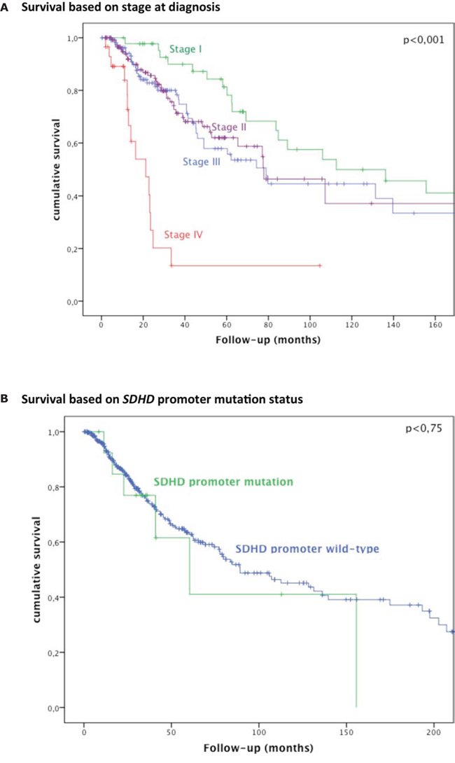Figure 4: Survival based on stage at diagnosis and SDHD promoter mutation status. Kaplan-Meier curves of overall survival in 400 patients with melanoma according to A. stage at diagnosis; B. SDHD promoter status (mutant vs wild-type).