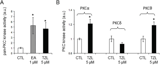 PKC kinase activity of cell lysates was measured using the pan-PKC activity assay from EnzoLife Sciences. Cells were lysed in TNESV lysis buffer (50 mM Tris, 1% Nonidet P-40, 2 mM EDTA, 100 mM NaCl and 2 mM Na3VO4). After centrifugation (15 min; 15,000 rpm; 4ºC), clarified supernatant was incubated with 10 μM TZL in the kinase buffer provided by the manufacturer (1 h at 30°C with 10 μM ATP). The reaction was stopped and the phosphorylation of a PKC substrate was measured by spectrophotometry as indicated in the manufacturer protocol. PKCα, -δ, and θ kinase assays were performed in a similar manner using 5 ng of purified PKC proteins (incubation for 1 h at 30°C with 10 μM ATP).
