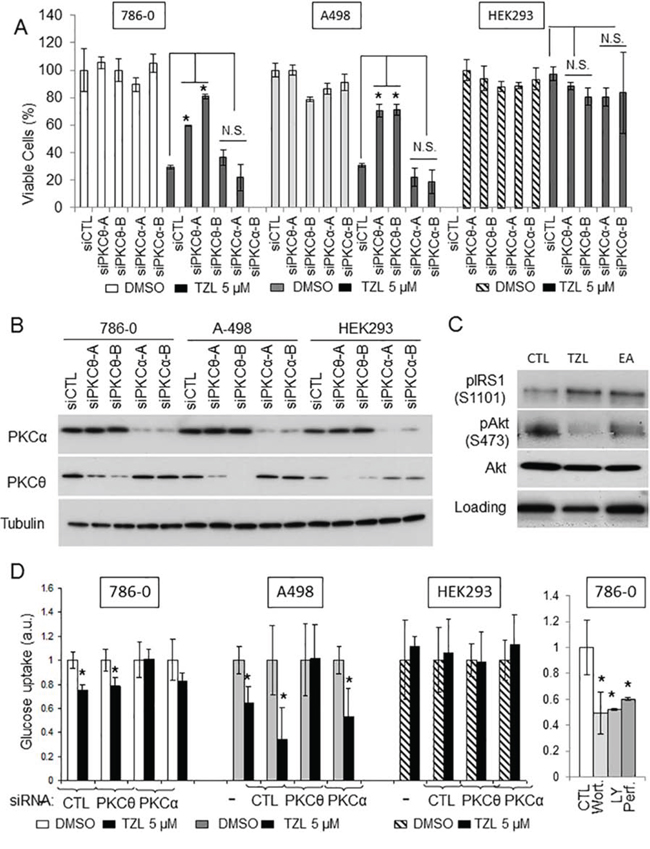 Figure 4: Tonantzitlolone effect is PKCθ-dependent. A. Viability of VHL-deficient cell lines A498 and 786-0 was assessed following transient silencing of PKCθ or PKCα using 2 distinct small interference RNAs. The embryonic kidney cell line HEK293 was used as control. B. Silencing efficiency was assessed by immunoblotting. C. Effect of TZL on the insulin pathway was assessed by immnublotting. EA was used as a positive control. D. Effect of TZL on glucose uptake was assessed in VHL-deficient 786-0 and A498 cells. The embryonic kidney cell line HEK293 and treatment of 786-0 cells with the PI3K/Akt inhibitors wortmannin, LY294002 and perifosine (5 μM; 4 h) were used as controls. *p < 0.05; N.S.: non-significant; EA: englerin A; TZL: tonantzitlolone; Wort: wortmannin; LY: LY294002; Perf: perifosine.