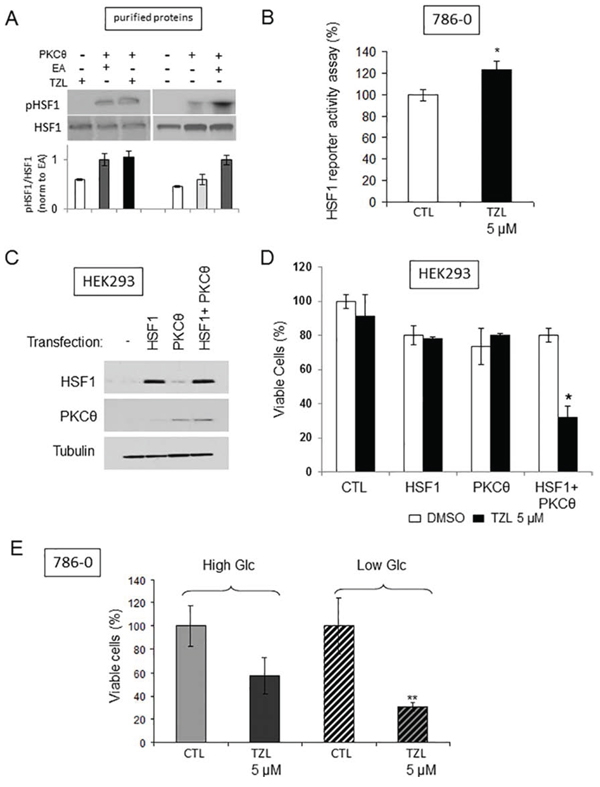 We previously established a link between PKCθ and HSF1, a transcription factor known to induce tumor glucose dependency [12, 13], namely direct phosphorylation and heat-shock-independent activation of HSF1 by PKCθ [4]. We thus investigated whether TZL also induced a direct heat-shock-independent activation of HSF1. Using an in vitro kinase assay with purified PKCθ and HSF1 proteins, we demonstrated that TZL was able to induce PKCθ-dependent HSF1 phosphorylation (Figure 5A). Furthermore treatment of 786-0 cells with TZL (5 μM, 24 h) increased HSF1 transcriptional activity as measured with a luminescence-reporter plasmid assay (Figure 5B) and similarly to effects observed with EA, TZL cytotoxicity was observed only when HSF1 and PKCθ were simultaneously overexpressed in HEK293 cells (Figure 5C-5D). Also, TZL’s cytotoxicity was dependent on the extracellular glucose concentration (Figure 5E). Indeed, in low glucose media (1 g/L), TZL was significantly more cytotoxic than in high glucose media (4.5 g/L). Together these data demonstrate the ability of TZL to induce glucose dependency in CCRCC cell lines.