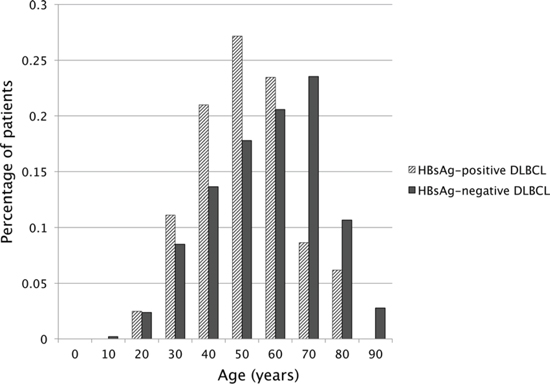 Previous studies from China and Singapore, another Asian country also with intermediate prevalence of HBV, have reported that 13.3% to 30.9% of DLBCL patients were HBsAg-positive, similar or even higher than the 13.8% in our study [17–20]. These results suggested that in HBV prevalent region, a certain percentage of DLBCL patients were chronically infected with HBV. We further found HBsAg-positive DLBCL patients showed unique clinical features, including an earlier disease onset age, a narrow range of onset age, a much more common involvement of spleen and retroperitoneal lymph nodes, and more advanced disease. An earlier disease onset age in HBsAg-positive patients was reported by studies from both Korea [3] and China [18, 19, 21]. A more advanced stage and frequent involvement of spleen in HBsAg-positive DLBCL patients were also reported by Wang et al. [18], but not by others [17, 19, 20, 22]. The discrepancy might be ascribed to the small sample sizes [17, 22], different prevalence of HBV infection, and inclusion of T-cell lymphoma which is less frequently associated with HBV infection [17, 23].