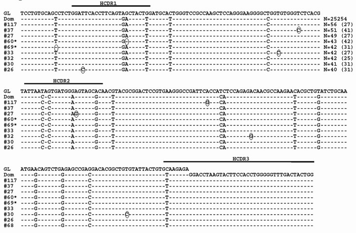 Figure 6: Normal BMPC clones with identical HCDR3s. The largest clone, which used the IGHV3-7 gene (Dom), is shown here with putative subclones. Dashes indicate sequence homology with the IGHV3-7 GL sequence and nucleotide changes from the dominant clone are circled. Sequence numbers with an asterisk indicate that the nucleotide deviations from the dominant clone reflect reversions back to GL. Values in parentheses represent the number of identical sequences found in cDNA.