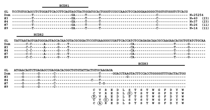 Figure 4: MM subclones using IGHV3-74 with non-synonymous HCDR3s. Representative subclones with the identical IGHV gene as the dominant clone (Dom) but with HCDR3s that varied by 1 amino acid from the dominant sequence when DNA is the starting template are shown. Dashed lines indicate sequence homology with the IGHV3-74 GL sequence. Nucleotide deviations from the dominant clone are shown and amino acid changes are circled. Values in parentheses represent the number of identical sequences found in cDNA.