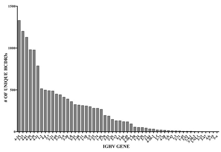 Figure 5: Number of unique HCDR3s and frequency of specific IGHV gene usage in normal BMPCs. The sequences shown here represented 54 IGHV genes.