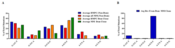 Figure 7: Characterization of mutations in BMPC and MM sequences. For each sequence analyzed, nucleotide substitutions were counted, grouped into 6 complementary categories and represented as the percent of total mutations for that sequence. Groups of specific sequences were averaged and plotted. (A) The average expression of mutations in non-dominant (Non-Dom) BMPC sequences (n=10) and Non-Dom MM sequences (n=18; 8 from this pyrosequencing study and 10 from Sanger sequencing) were compared to the average expression of mutations in the dominant (Dom) BMPC and MM clones. (B) Characterization of the nucleotide substitutions exhibited by the putative MM subclones