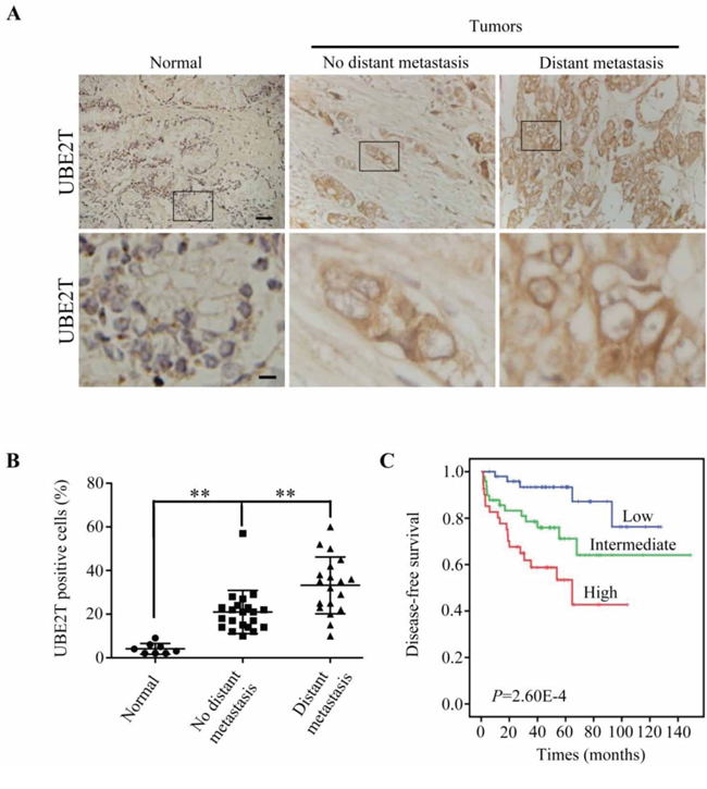 Figure 1: UBE2T is overexpressed and related to the prognosis of prostate cancer patients. A. Immunohistochemical analysis of UBE2T levels in different stages of prostate cancer in a tissue array. From left to right are representative images of UBE2T expression in normal tissue, prostate cancer tissues without or with metastasis. Normal: normal tissues; No distant metastasis: cancer tissues without distant metastasis; Distant metastasis: cancer tissues with distant metastasis. Lower panels are the higher magnification of indicated areas in upper panel. B. Analysis of UBE2T positive cells in the above prostate cancer tissue array. C. Survival analysis of patients with prostate cancers in a publically available dataset (GSE21032). Scale bars, 100 μm (A upper panel) and 20 μm (A lower panel). **P < 0.01 in panel B based on the Student t test. Error bars, SD.