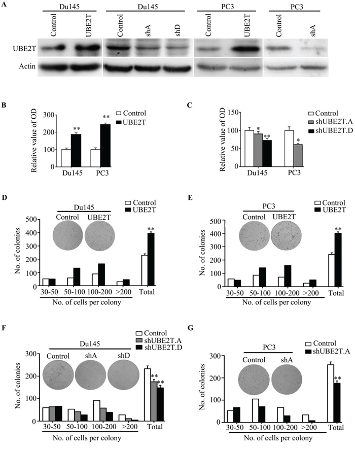 Figure 2: UBE2T promotes proliferation of prostate cancer cells. A. Western Blot analysis of UBE2T levels in the established cell lines. B. MTT assay shows the obviously increased proliferative rate in PC3 and Du145 expressing pBabe-UBE2T. C. MTT assay shows the decrease of proliferative rate in cells expressing pSuper-shUBE2T. D. and E. Colony formation assay demonstrates an increase in the number of clones by overexpression of UBE2T in PC3 and Du145. F. and G. Colony formation assay demonstrates a decrease in number of clones by knockdown of UBE2T. shA and shD for shUBE2T.A and D respectively. *P < 0.05, **P < 0.01 based on the Student t test. Error bars, SD.