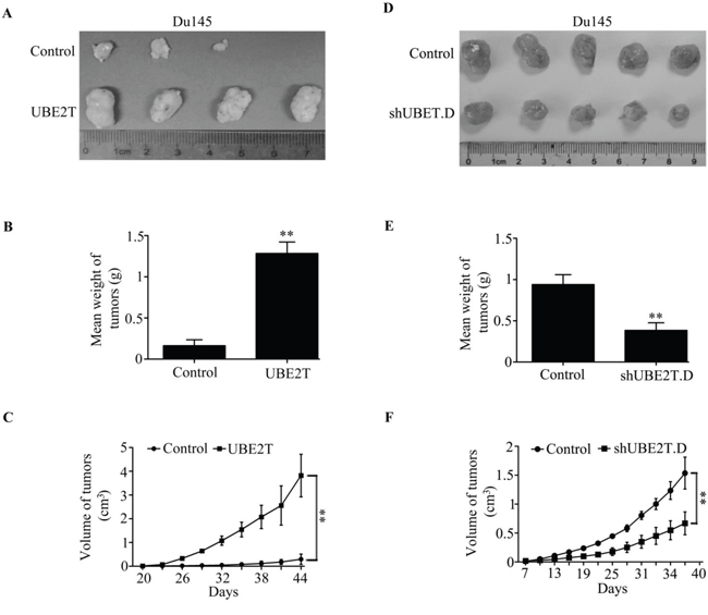 Figure 3: UBE2T promotes tumor growth of prostate cancer cells in vivo. One million of Du145 cells with ectopic expression of UBE2T A–C. or five million cells with UBE2T silence D–E. were injected into nude mice subcutaneously. 60 days after inoculation each tumor was taken for picture (A and D) and weight measurement (B and D). Tumor growth from each cell lines was measured each 3 days since the appearance of tumors and tumor volume was calculated and plotted C. and F. n = 5 for each cell lines. **P < 0.01 based on the Student t test. Error bars, SD.