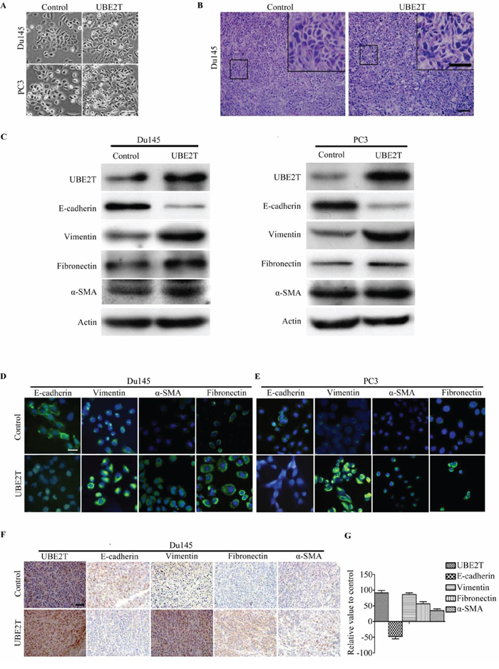 Figure 4: UBE2T induces EMT of prostate cancer cells. A. Micrographs showing the morphology of Du145, PC3 with overexpression of UBE2T and their corresponding control cells. B. H&E staining of xenograft tumor sections. C. Western blot analysis of the expression of the epithelial cell marker E-cadherin and the mesenchymal cell markers vimentin, fibronectin and alpha-smooth muscle actin in PC3 and Du145 cells overexpressing UBE2T. D. and E. Immunofluorescence images of EMT markers in Du145 and PC3 overexpressing UBE2T. F. Images of immunochemistry staining for UBE2T and EMT markers in sections of xenograft tumors from Du145 cells with or without overexpression of UBE2T. G. Positive cells in (F) were counted and plotted in histogram. Scale bars: 50 μm (A), 100 μm (B and F) and 50 μm (inserts in B), 20 μm (D and E).