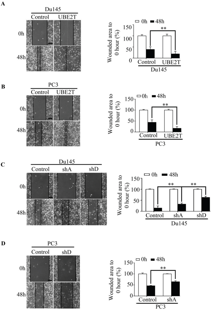 Figure 5: UBE2T promotes migration of prostate cancer cells. A–B. Wound healing assay revealed a faster wound-healing speed in PC3 and Du145 expressing UBE2T and the unhealed area was measured and the values were shown in histogram. The initiative unhealed area was used as a 100% control. C–D. Wound healing assay revealed a depressed speed in both cell lines with silent UBE2T expression, and the unhealed area was measured and the values were shown in histogram. The initiative unhealed area was used as a 100% control. shA and shD for shUBE2T. A and D respectively. Scale bars: 100 μm. **P < 0.01 based on the Student t test. Error bars, SD.