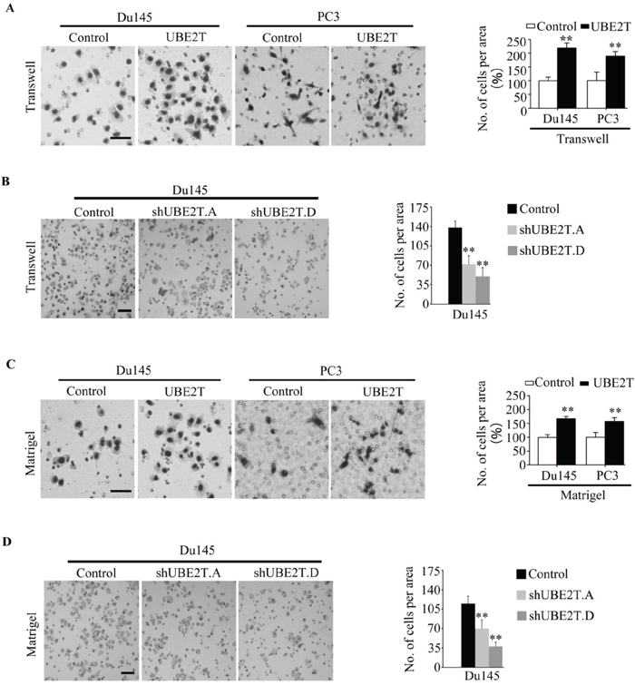 Figure 6: UBE2T promotes the mobility of prostate cancer cells. A. PC3 and Du145 expressing UBE2T possessed more migrating abilities in traswell assay. The migrated cells were plotted as the average number of cells in five random fields. B. Du145 with silent expression of UBE2T possessed less migrating abilities in traswell assay. The migrated cells were plotted as the average number of cells in five random fields. C. PC3 and Du145 expressing UBE2T possessed more invaded abilities in matrigel assay. The invaded cells were plotted as the average number of cells in five random fields. D. Du145 with silent expression of UBE2T possessed less invaded abilities in matrigel assay. The invaded cells were plotted as the average number of cells in five random fields. Scale bars: 100 μm (A and C), 50 μm (B and D). **P < 0.01 based on the Student t test. Error bars, SD.