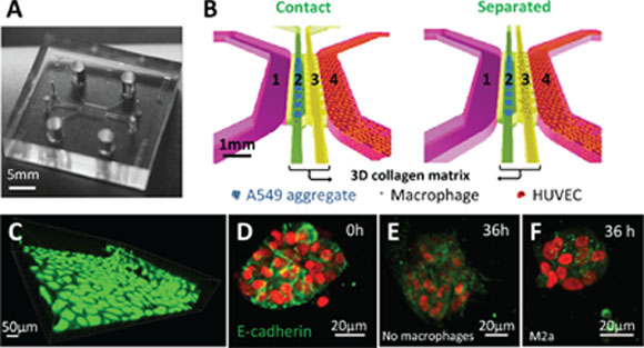 Figure 1: Microfluidic co-culture platform to study the interactions between carcinoma aggregates and macrophages. A. Photograph of the polydimethyl siloxane (PDMS) device. B. Schematic images of an enlarged, isometric view of the channel layout showing the orientation of co-culturing carcinoma cell aggregates and endothelial cells (HUVECs), with macrophages either physically contacting (left panel; 1: media channel; 2: A549 aggregates and macrophages gel channel; 3. supporting gel channel; 4: HUVEC monolayer) or cultured under separated conditions (right panel; 1: media channel; 2: A549 aggregates gel channel; 3. macrophages gel channel; 4: HUVEC monolayer). C. HUVEC monolayers formed in the microfluidic channel. Green: GFP-HUVECs. D–F. E-cadherin immunocytochemical staining. E-cadherin expression of A549 aggregates at 0 h (D), E-cadherin expression of A549 aggregates in the absence (E) or presence (F) of macrophages at 36 h. Green: E-cadherin staining, red: mCherry A549 nuclei.