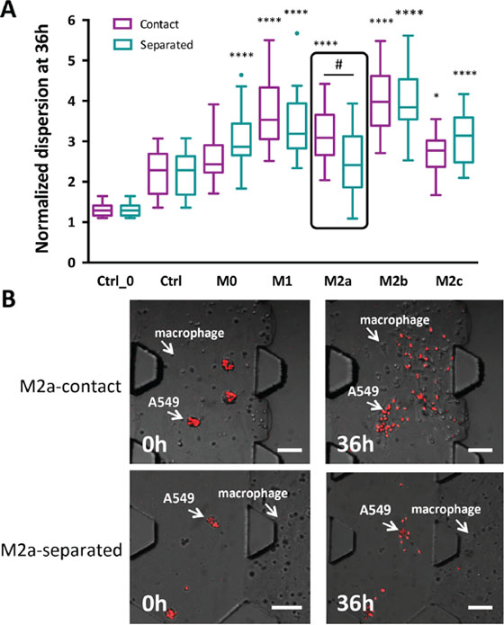 Figure 3: A549 aggregates dispersion induced by various subtypes of macrophages. A. Quantitative measurement of aggregate dispersion at 36 h for macrophages under either “contact” or “separated” conditions. * indicates statistical calculations compared to no macrophage conditions, where *P < 0.05 and ****P < 0.0001. # indicates a statistical calculation between “contact” versus “separated” culture conditions, where #P < 0.01. Data are shown as a box plot with Tukey outliers. Ctrl_0 represents the control without HUVECs and without macrophages. Ctrl represents the control with HUVECs but without macrophages. B. Images of M2a inducing A549 aggregate dispersion under “contact” and “separated” conditions at 0 h or after culture for 36 h. Red: mCherry A549 nuclei. Scale bars 100 μm.