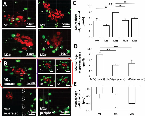 Figure 4: Migration of macrophage subtypes. A. Migration direction (white arrows) of M0, M1, M2b, and M2c subtypes of macrophages under “contact” conditions with the carcinoma aggregates imaged at 6 h. B. Time-lapsed images of the M2a subtype under “contact” condition at specific times (top left). The migration direction (white arrows) of the M2a subtype that were ≤50 μm (M2a-proximity; top right) or ≥50 μm (M2a-peripheral; bottom left) from the carcinoma aggregate under “contact” conditions or M2a cells under “separated” conditions (bottom right). Cells were imaged for 6 h. C. Migration speed of macrophages situated ≤50 μm from the carcinoma aggregates. D. Migration speed of M2a cells situated either ≤50 μm (M2a-proximity) or ≥50 μm (M2a-peripheral) from the carcinoma aggregates and grown under “separated” conditions. E. Radial velocity of M0, M1 and M2a subtypes under “contact” conditions. All data shown are mean ± SEM of at least three experiments. *P < 0.05, **P < 0.01. Green: DiO-labeled macrophages, red: mCherry A549 nuclei.