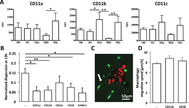 Figure 5: Involvement of integrins in carcinoma aggregate dispersion by macrophages. A. Surface expression of CD11a, CD11b, and CD11c integrins on macrophage subtypes, as determined by FACS and expressed as mean fluorescence intensity (MFI). B. Normalized aggregate dispersion induced by M2a macrophages in the absence (–) or presence of various blocking antibodies at 12 h. *P < 0.05 and **P < 0.01. C. Fluorescent image showing an M2a macrophage extending a projection (white arrow) as it attempts to dissociate a cancer cell from the aggregate. Green: DiO-labeled macrophages, red: mCherry A549 nuclei. D. Migration speed of M2a macrophages in the absence or presence of the indicated blocking antibodies. Data shown are mean ± SEM of three experiments.