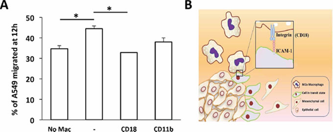 Figure 6: Transwell migration assay of A549 carcinoma cells. A. Migration of A549 cells in the absence (No Mac) or presence of M2a macrophages without (–) or with the indicated blocking antibodies, measured after 12 h. Data are the mean ± SEM. *P < 0.05. B. Diagram showing the possible adhesion mechanism governing M2a-induced A549 aggregate dispersion via the interaction of ICAM-1 and β2 integrin.