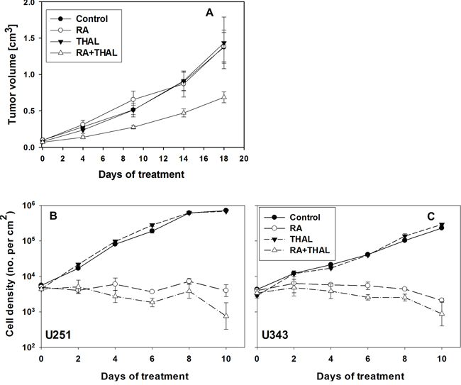 Figure 1: The effect of RA and THAL as sole agents or in combination on U251 xenografts. A. Volume growth as function of time during treatment. The treatment of animals with RA or THAL as a sole compound did not affect xenograft growth in comparison to untreated controls. Treatment with RA in combination with THAL caused significant growth delay of tumours in comparison to control or animals which were treated with RA or THAL as sole compounds. Mean values and standard errors are shown. The effect of RA and THAL on cell proliferation in vitro B, C. The treatment of U251 (B) or U343 (C) with RA inhibited cell proliferation in comparison to untreated cells. The treatment with THAL as a sole compound did not affect cell proliferation in comparison to untreated controls but a significant sensitizing effect of THAL in combination with RA (P = 0.0007 and P = 0.015 for U251 and U343, respectively for days 4–10) was observed in comparison to cells treated with RA only.