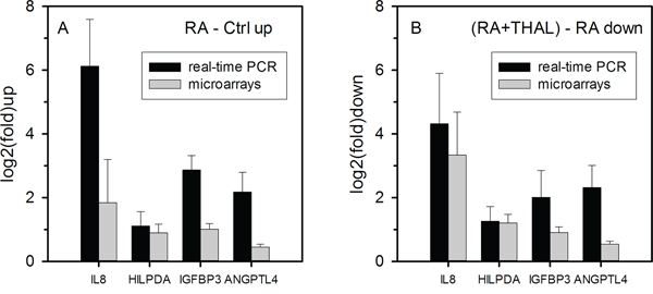 Figure 2: Gene expression analysis of RNA isolated from tumours after treatment. A. Validation by real-time PCR of the expression of RA-induced candidate genes selected from microarray analysis on the basis that their upregulation in tumours treated by RA was suppressed in tumours treated with RA + THAL. log2(fold) upregulation relative to control tumours (mean values and ranges for 2 tumours) are shown. Upregulation measured by real-time PCR was at least as strong determined from microarrays. B. log2(fold) downregulation of gene expression in tumours treated with RA + THAL relative to tumours treated with RA alone (mean values and ranges). Downregulation by RA + THAL relative to RA was at least as strong as determined by microarray analysis and comparable with upregulation by RA alone, confirming efficient suppression by adding THAL to RA.