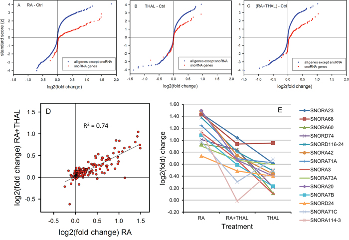 Figure 3: Differential expression of snoRNA genes compared with all other genes in tumours after treatment with RA, THAL or the combination RA + THAL. Cumulative distribution of down-and upregulation shown as the Normalized Score versus log2(fold) change in tumours treated with A. RA, B. THAL, and C. RA + THAL relative to untreated controls. RA caused upregulation of approximately 50%, and THAL of approximately 25% of the snoRNA genes. RA + THAL upregulated aproximately the same fraction of snoRNA genes as RA although the degree of upregulation was reduced. D. Upregulation of snoRNA by RA + THAL correlated well with upregulation by RA alone. E. Upregulation by RA-THAL was intermediate between the levels in RA and THAL tumours for the majoríty of the most upregulated snoRNA genes.