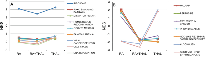 Figure 4: Pathway analysis (GSEA) for genes regulated by RA, THAL, or RA+THAL. The Normalized Enrichment Score (NES) is compared for treatment by RA, RA + THAL, and THAL. A. Pathways showing similar up- or downregulation in tumours treated by RA and THAL alone. NES tended to be slightly lower in RA + THAL treated tumours. B. Pathways showing opposite differential regulation in tumours treated RA and THAL alone (up vs. down, or down vs. up). Five pathways (Malaria, Pertussis, Pathways in Cancer, Prion Diseases, Nod-like Receptor Signaling Pathway) showed the same down-regulation in RA + THAL as in THAL-treated tumours, while two pathways (Alcoholism, Systemic Lupus Erythematosus) showed the same down-regulation in RA + THAL as in RA-treated tumours.