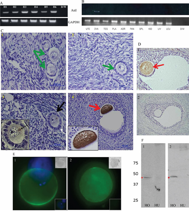 Figure 1: ASTL/SAS1B has ovary and oocyte restricted expression among normal human tissues, and a population of SAS1B is found on the oolemma of ovulated human oocytes. Panel A: RT-PCR analyses of 6 normal human ovarian cDNAs (H1-H6) using a c-terminus ASTL specific primer set show 309 base pair ASTL amplicons in each specimen. Panel B: ASTL expression was restricted to ovarian specimens (lane OVA) while other tissues (uterus, testes, placenta, adrenal, pancreas, spleen, kidney, liver and leukocytes) were ASTL silent. GAPDH was used as a loading control for all RT-PCR assays. Panels C and D: Immunohistochemical localization of SAS1B in human ovarian tissue sections with anti-SAS1B antibodies (C- IM antibodies and D1- PPpAb, D2- PIM antibodies/ normal rabbit IgG). SAS1B protein was localized to oocytes in primary-secondary transition follicles (C3), early antral follicles (C4) and beyond (D1). Oocytes within primordial follicles (C1) and small primary follicles i.e. resting follicles (C2) did not express SAS1B (green arrows). An early developing primary-secondary transition follicle (black arrow, C3, with development of a bilaminar layer noted at white arrow) shows initiation of SAS1B expression in the perinuclear region of the oocyte (inset) presumably in the Golgi apparatus. Panel E: Live stained fertilized human oocytes show membrane staining of SAS1B by immunofluorescence. Top inset shows phase image and bottom inset shows PIM control. Panel F: Western blots reveal a 46 kDa SAS1B protein (red asterisk) in human ovarian protein extracts (HO) with IM antibodies (F1, HO) and PPpAb (F2, HO). In protein extracts from normal human uterus (F1, HU and F2, HU) SAS1B was not detected.