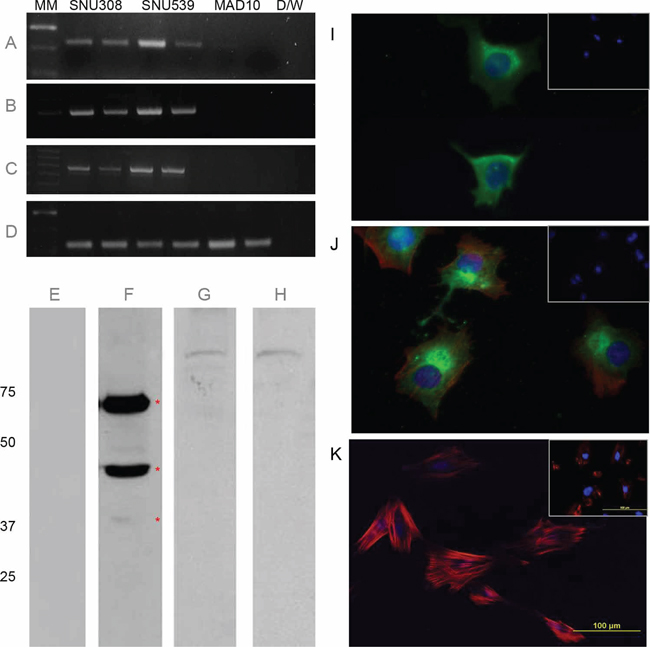 Figure 3: ASTL/SAS1B expression in MMMT derived cell lines. cDNAs from MMMT derived cell lines S08-38710 and SNU539 along with control MAD10 cells were probed (in duplicate) for ASTL using domain specific primers (Panels A, B, C represent ASTL amplicons of 237 base pair N-terminus, 309 base pair C-terminus and 579 base pair catalytic region, respectively). Panel D: ASTL transcription was noted in both S08-38710 and SNU539 while MAD10 was ASTL negative. GAPDH was used as a loading control. Panels E–H: On Western blots, major immunoreactive SAS1B protein isoforms (red asterisks, F) of ~46 kDa [predicted from primary sequence] and ~65 kDa, and a less abundant ~36-37 kDa band, were identified in Celis extracts of SNU539 cells probed with IM antibodies, while blots exposed to PIM antibodies (E) were negative. MAD10 protein extracts showed no specific immunoreactivity with IM antibodies (H) or control PIM antibodies (G). In fixed S08-38710 (Panel I) and SNU539 (Panel J) cells IM antibodies localized SAS1B in the cytoplasm with high concentrations noted in the perinuclear region (Green is SAS1B, blue is DAPI nuclear counterstain, red is phalloidin counterstain for actin). No SAS1B immunoreactivity was noted in MAD10 cells (Panel K). Insets (I-K) show lack of immunoreactivity with PIM antibody on the respective cell types.