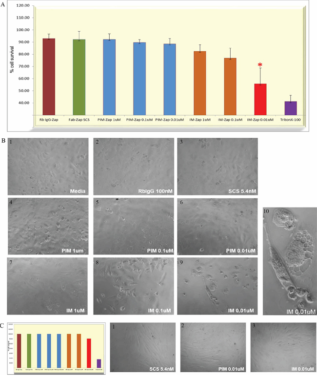 Figure 7: Arrest of SNU539 cell growth with a saporin-immunotoxin targeting SAS1B. Cells in culture were exposed to varying concentrations of IM and PIM antibodies complexed with a fixed concentration of 5.42 nM secondary saporin immunoconjugate and monitored over 72 hours. Cells were observed by light microscopy and assayed for total biomass; culture supernatants were assayed for LDH levels. Panel A: This shows mean percent survival of SNU539 cells in the presence of IM antibody saporin conjugates (N=4 experiments). IM antibody at concentrations from 1 μM to 1 nM was used and concentrations of 1–10 nM showed significant inhibitory effects (7A and 7B) on growth while PIM antibodies at identical concentrations did not (blue bars 7A). Triton X-100 detergent was used as positive control to arrest growth at the outset of the treatment period (purple bar 7A). Normal rabbit IgG saporin, saporin conjugate alone (SCS), or media alone did not demonstrate growth arrest (7A). Panel B: Deleterious effects on cells noted by light microscopy include cell vacuolation, cell rounding, pyknosis, and death (7B9, magnified in 7B10). Panel C: Under identical conditions SAS1Bneg MAD10 cells did not exhibit growth arrest in culture (7C) and MAD10 cells did not demonstrate deleterious microscopic effects after similar treatments (Panel 7C1–7C3).