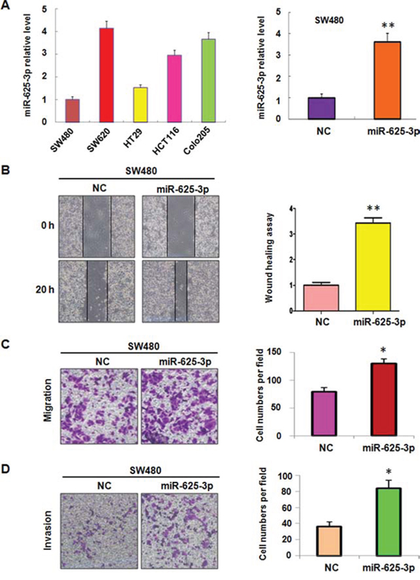 Figure 1: Over-expression of miR-625-3p promoted cell migration and invasion in SW480 cells. NC: negative control; miR-625-3p: miR-625-3p mimic. *P < 0.05; **P < 0.01 vs control. A. miR-625-3p level was measured by real-time RT-PCR in five CRC cell lines (left panel) and SW480 cells with miR-625-3p mimic treatment (right panel). B. Left panel, the cell motility was detected using wound healing assay in SW480 cells transfected with miR-625-3p. Right panel, Quantitative results are illustrated for left panels. C-D. Left panel, the cell migration and invasion were detected by uncoated (C) and coated (D) Transwell chambers assay. Right panel, Quantitative results are illustrated for left panel.