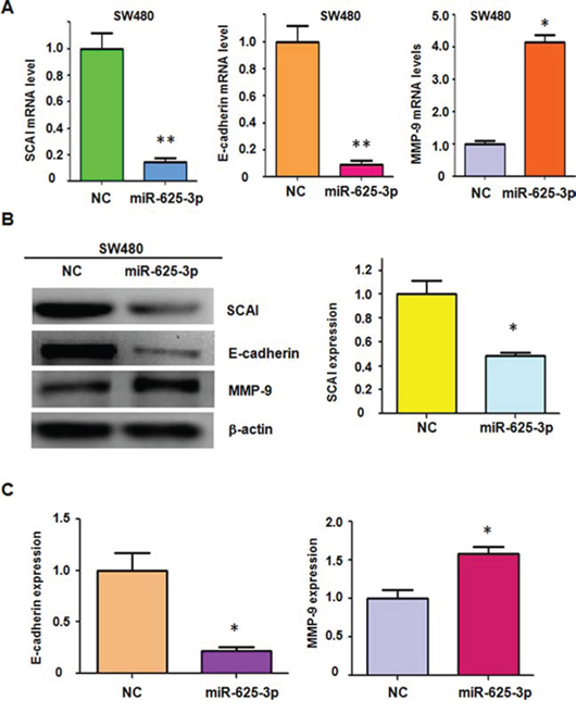 Figure 4: Over-expression of miR-625-3p inhibited SCAI expression in SW480. NC: negative control; miR-625-3p: miR-625-3p mimic. *P < 0.05; **P < 0.01 vs control. A. Real-time RT-PCR was conducted to detect the expression of SCAI, E-cadherin, and MMP-9 at the mRNA levels in SW480 cells transfected with miR-625-3p mimic. B. Western blotting analysis was performed to detect the expression of SCAI, E-cadherin, and MMP-9 in SW480 cells transfected with miR-625-3p mimic (left panel). Quantitative result of SCAI expression is presented (right panel). C. Quantitative results are illustrated for panel B.