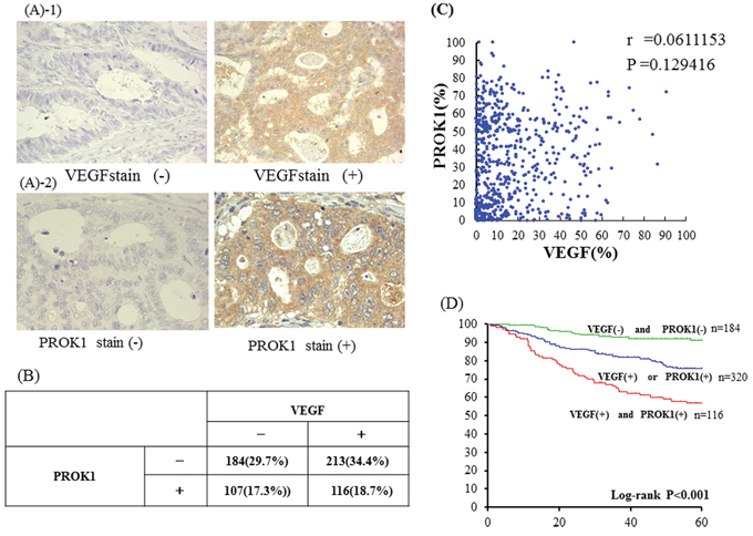 Figure 1: A-1. Immunohistochemical staining with anti-VEGF mAb Left: VEGF expression was not detected inprimary colorectal cancer lesion. Right: VEGF expression was detected in primary colorectal cancer lesions. A-2. Immunohistochemical staining with anti-PROK1 mAb Left: PROK1 expression was not detected inprimary colorectal cancer lesion. Right: PROK1 expression was detected in primary colorectal cancer lesions. B. The relationship between VEGF expression and PROK1 expression in sporadic 620 patients with primary colorectal cancer VEGF expression was observed in 325 (52.5%) of the 620 cases, whereas PROK1 was expressed in 223 (36.0%) of the 620 cases. Neither VEGF nor PROK1 was expressed in 184 (30.1%) of the 620 cases. Both proteins were expressed in 115 (18.6%) of the 620 cases VEGF alone was expressed in 210 (33.9%) of the 620 cases, and PROK1 alone was expressed in 108 (17.4%) of the cases. C. The correlation between VEGF expression and PROK1 expression The correlation coefficient between VEGF expression and PROK1 expression was r = 0.11. Correlation was not observed. D. Relationship between PROK1/VEGF expression and survival rate in colorectal cancer patients. The 5-year survival rate was 91.3% in the colorectal cancer patients with expression of neither VEGF nor PROK1, 76.4% with expression of either VEGF or PROK1; and 57.3% with expression of both VEGF and PROK1.