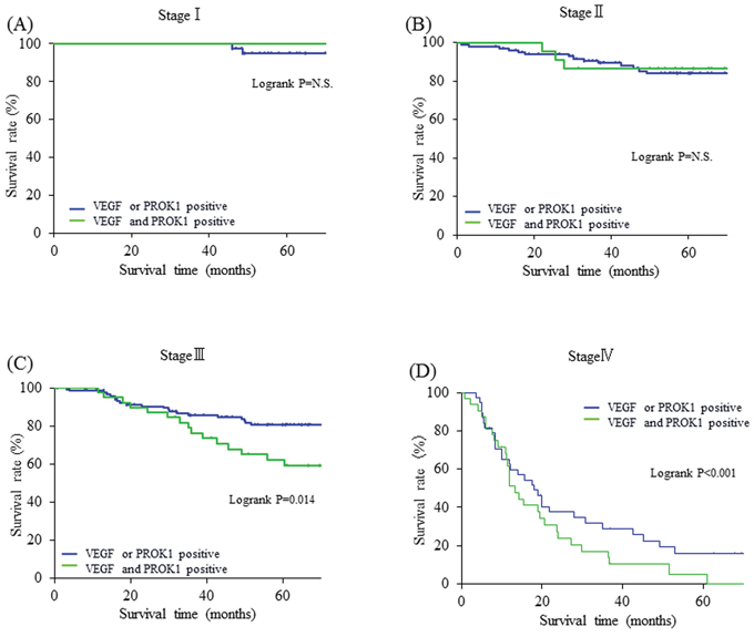 An investigation of the relationship between VEGF/PROK1 protein expression and clinicopathological factors revealed that the group that expressed either of the angiogenic proteins included a significantly greater number of cases with a substantially lymphnode metastasis and hematogenous metastasis (TMN advanced-stage III, IV) relative to the group lacking the expression of both proteins. Furthermore, the group that expressed both proteins had a significantly greater number of cases with lymphnode metastasis, hematogenous metastasis, and TMN advanced-stageIV tumors relative to the other 2 groups. No relationships were found with respect to gender, age, histological type, histological type, lymphatic invasion, venous invasion, and peritoneal metastasis (Table 1).