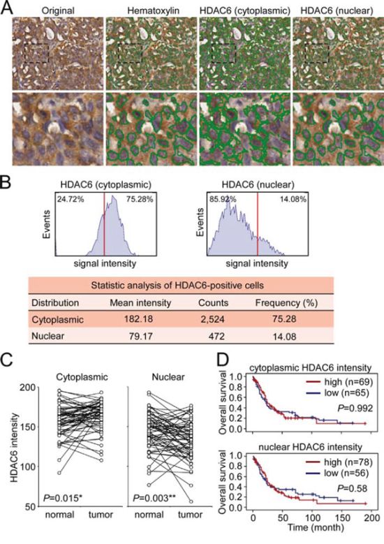 Figure 1: Analysis of HDAC6 cytoplasmic and nuclear localization. A. Representative image showed the identification of hematoxylin-stained nucli and cytoplasmic and nuclear HDAC6 in a section of paraffin-embedded NSCLC specimen using HistoQuest software. B. Quantitative analysis of the intensity and frequency of cytoplasmic and nuclear HDAC6. Red line indicated the 50% cutoff of the HDAC6 intensity. C. The signal intensity of cytoplasmic and nuclear HDAC6 in the paired normal tissues and tumors in 63 NSCLC patients was plotted. *P < 0.05, **P < 0.01. D. Kaplan-Meier log-rank analysis for the overall survival of the 134 NSCLC patients with low and high intensity of cytoplasmic and nuclear HDAC6 in the tumor regions.
