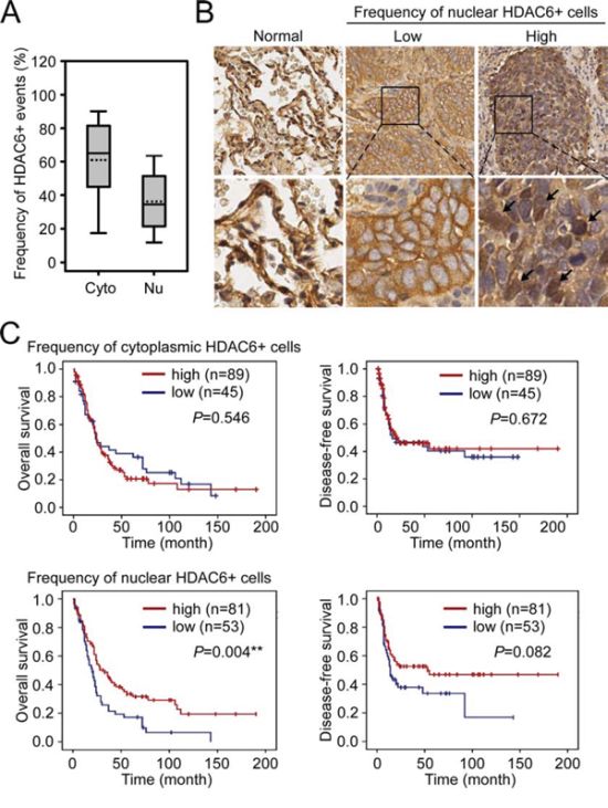 Figure 2: The association of nuclear HDAC6 frequency with NSCLC patient survival. A. The frequency (%) of cytoplasmic and nuclear HDAC6 in the tumor parts of the 134 NSCLC patients. Cyto, cytoplasmic HDAC6; Nu, nuclear HDAC6. B. The representative images demonstrated the low and high frequency of nuclear HDAC6+ cells in tumor regions. Images of HDAC6 staining in two normal tissues were shown for comparison. C. Kaplan-Meier log-rank analysis for the overall and disease-free survival of the 134 NSCLC patients with low and high frequency of cytoplasmic (upper panels) and nuclear (lower panels) HDAC6 in the tumor regions. **P < 0.01.