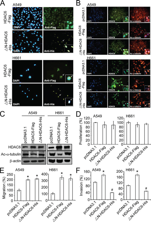 The plasmid pcDNA3.1(+)-flag-HDAC6 obtained from Addgene (Plasmid number #13823). The pcDNA3.1-ΔN-HDAC6-His plasmid was constructed by restriction enzyme digestion (NotI and EcoRI) of the full-length human HDAC6 cDNA from the plasmid pcDNA3.1(+)-flag-HDAC6 and ligated into the NotI/EcoRI restriction enzyme sites within the pcDNA3.1C-His plasmid. The pcDNA3.1(+)-flag-HDAC6 and pcDNA3.1-ΔN-HDAC6-His plasmids were transfected into A549 and H661 cells (3 × 106 cells/10-cm dish) using Lipofectamine 2000 (Invitrogen, Carlsbad, CA, USA).
