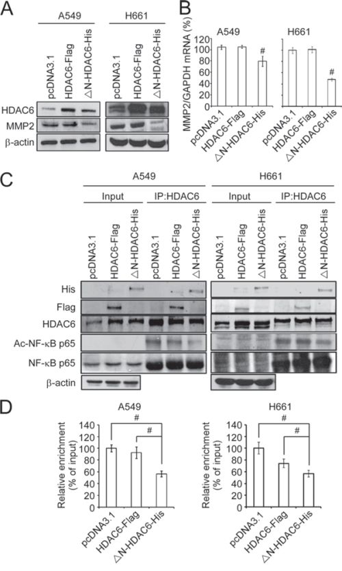 Figure 4: Nuclear HDAC6 inhibits MMP2 through de-acetylating NF-κB p65 subunit. A. A549 and H661 cells were transfected with pcDNA3.1, HDAC6-Flag or ΔN-HDAC6-His, and the expression of HDAC6, MMP2 and β-actin were analyzed by Western blot. B. The mRNA expression of MMP2 was analyzed by real-time PCR. C. The interaction of HDAC6 and NF-κB was analyzed by immunopreciptation using the antibody against HDAC6 in pcDNA3.1-, HDAC6-Flag- or ΔN-HDAC6-His-transfected A549 (left) and H661 (right) cells. D. Chromatin immunoprecipitation was performed to the pcDNA3.1-, HDAC6-Flag- or ΔN-HDAC6-His-transfected A549 (left) and H661 (right) cells. Real-time PCR was performed using the primers for NF-κB binding sites in MMP2 promoter.