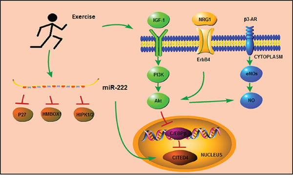 In this review, we summarize the protective effects of exercise against cardiac injury and address the underlying cellular and molecular mechanisms. Exercise increases myocardial oxygen supply and extraction, reduces myocardial fibrosis and cardiomyocyte apoptosis, promotes angiogenesis, and also improves cardiac function and cardiomyocyte survival in various CVD. For the cellular mechanisms, we provide an overview of both exercise-induced cardiac hypertrophy and renewal, and exercise-induced mobilization of EPCs to proliferate, migrate and differentiate into mature endothelial cells capable of regeneration and angiogenesis as primary contributors. For the molecular mechanisms, we summarize C/EBPβ-Cited4 and IGF-1-PI3k-Akt as the main signaling pathways mediating the changes in cardiomyocytes induced by exercise. Exercise also has established relationships with miRNAs, with recent reports documenting that exercise induced upregulation of miRNAs-29a and -29c correlates with a significant decrease in left ventricular collagen gene and protein concentration [92]. In addition, the expression of miR-222 was increased upon exercise to regulate myocyte growth via targeting of p27, HMBOX1, and HIPK1/2. Also, downregulation of miRNA-1, -133a, -133b and -214 were observed in the exercised heart [92]. Thus, the protective effects of exercise against myocardial damage are clearly pleiotropic in their mechanisms.