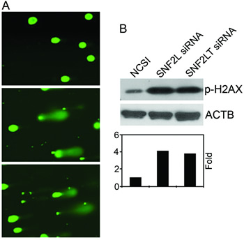 Figure 4: Singular v dual knockdown of SNF2L and SNF2LT and DNA damage. A, MDA-MB-468 cells were transfected with SNF2L siRNA, SNF2L siRNA or NCSI. 48 hours after transfection, DNA damage was analyzed by the Comet assay and the results showed damaged DNA (the comet tail) outside the nucleus after treatment of SNF2LT siRNA (lower panel), SNF2L siRNA (middle panel) compared to undamaged DNA in the cells treated with NCSI (upper panel). B, the surrogate DNA damage gene, p-H2AX showed increased expression following either SNF2L or SNF2LT knockdown (upper panel) and increased fold expression of p-H2AX (lower panel). Each experiment was performed in triplicate and repeated at least four times.
