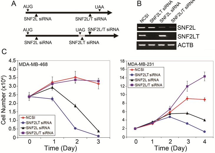 Figure 3: Singular v dual knockdown of SNF2L and SNF2LT and cell growth. A, siRNAs and their targeted areas are depicted. B, SNF2L siRNA (12578) selectively knocked down SNF2L; SNF2LT siRNA (A1IS) selectively knocked down SNF2LT; and SNF2L/T siRNA (12667) knocked down both SNF2L as well as its isoform, SNF2LT. siRNA (NCSI) (RNAi-neg) was used as the negative control. ACTB served as housekeeping gene. C, singular knockdown of either SNF2L or SNF2LT significantly inhibited the growth of HM lines (MDA-MB-468 and MDA-MB-231). Dual knockdown of SNF2L as well as SNF2LT, however, was permissive of growth in HM lines. Each experiment was performed in triplicate and repeated at least four times.