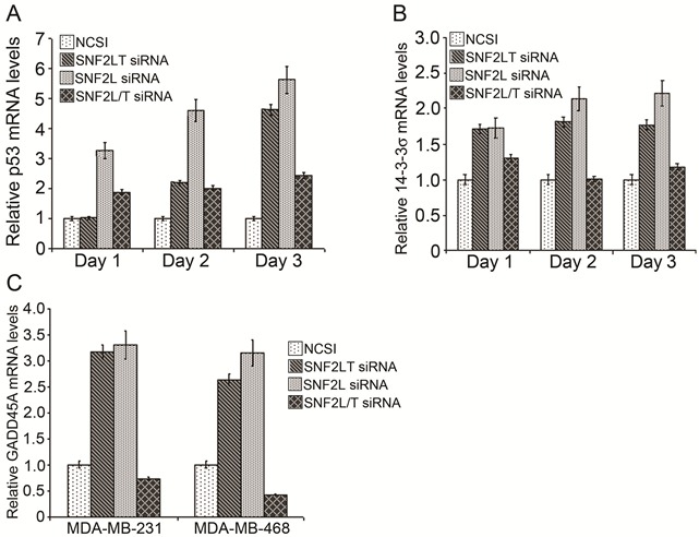 Figure 5: Singular v dual knockdown of SNF2L and SNF2LT and the cell cycle. MDA-MB-468 cells were transfected with the different siRNAs. A, singular knockdowns of either SNF2L or SNF2LT both led to substantial increases in p53 mRNA but dual knockdowns affected p53 mRNA less so by real time RT-PCR. B, singular knockdowns of either SNF2L or SNF2LT both led to substantial increases in the p53 target gene, 14-3-3σ but dual knockdowns did not affect 14-3-3σ. C, singular knockdowns of either SNF2L or SNF2LT both led to substantial increases in another p53 target gene, GADD45A but dual knockdowns did not affect GADD45A. Each experiment was performed in triplicate and repeated at least four times.