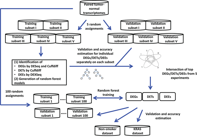 Figure 1 presents the analysis procedure of this study. We randomly divided the transcriptomes of 77 patients (Supplementary Table S1) into training and validation subsets of approximately equal sizes. We compared the transcriptomes of paired tumor and normal tissues across 77 patients and used DEXseq and DESeq to identify differentially expressed exonic regions (DEEs) and genes (DEGs), respectively, in the training subset. For comparison, we used Cuffdiff to identify differentially expressed transcripts (DETs) and DEGs. Identified DEGs/DETs/DEEs were trained on the training subset to yield Random Forest models, and then tested on the validation subset for tumor vs. normal tissue classification accuracy. The random assignment of patients was repeated five times (referred to as “five-replicate experiments”) to account for between-individual variations in the transcriptome (Supplementary Table S2).